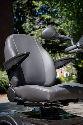 Bei Kurvenfahrten wird die Geschwindigkeit automatisch angepasst. Nach dem Abbiegen bringt sich der Fahrtrichtungsanzeiger wieder von selbst in die Ausgangsstellung, sodass Sie das Steuer nicht loslassen müssen. Mit einer Notstopp-Taste bringen Sie das Elektromobil bei Gefahr sofort zum Stillstand. Die automatische Magnetbremse verhindert zugleich das Wegrollen – auch bei starkem Gefälle. Der SOLO ist standardmäßig mit zwei Rückspiegeln ausgestattet, sodass Sie auch das Geschehen hinter sich stets im Blick haben. Für maximalen Komfort sorgt der gefederte, drehbare Stuhl mit Sitzverschiebung und Höhenverstellung sowie die große Bein- und Fußfreiheit.